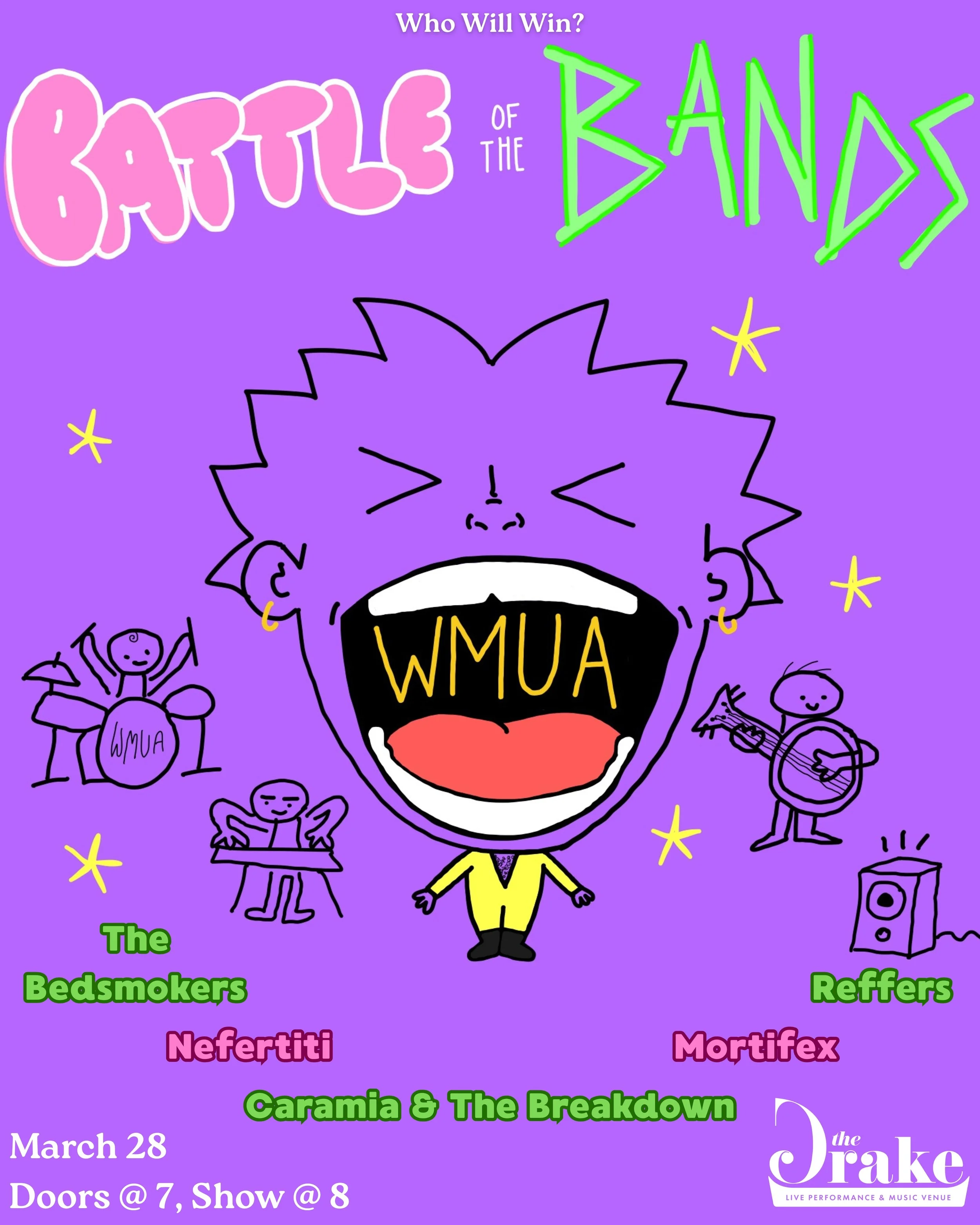 WMUA 91.1 FM presents the Battle of the Bands at The Drake, where local artists from the 5 colleges will compete for fame (campus bragging rights) and fortune (250 bucks).