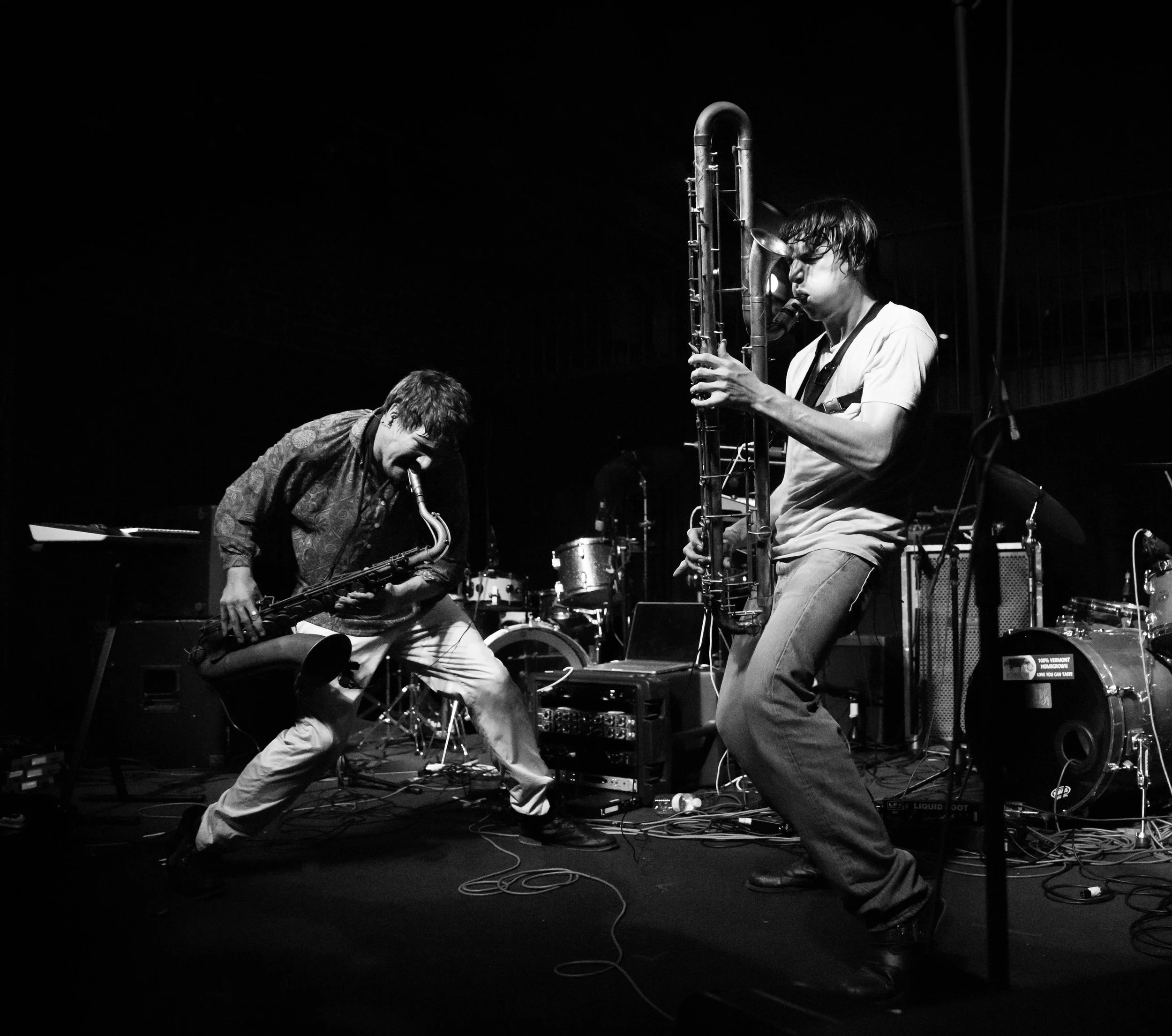 “When we were playing in the subways, we were playing entirely acoustic,” explains Wilbur. “It was just two saxes and a drum set. Then Wenzl acquired a baritone sax and we all started getting into music production and incorporating electronic music into our live shows.” At their performances, the band now plays through what they call a Reverse DJ setup, in which the live sound from their horns runs through Ableton software on their laptops to process recorded effects onto the output. In addition, to flesh out their sound on the road, the band began utilizing Moog synthesizers, an EWI (an electronic wind instrument that responds to breath in addition to touch), and other exotic woodwinds like the contrabass clarinet and bass saxophone. Wilbur has even added vocals to his repertoire on some tracks (something the subway never allowed him to do).